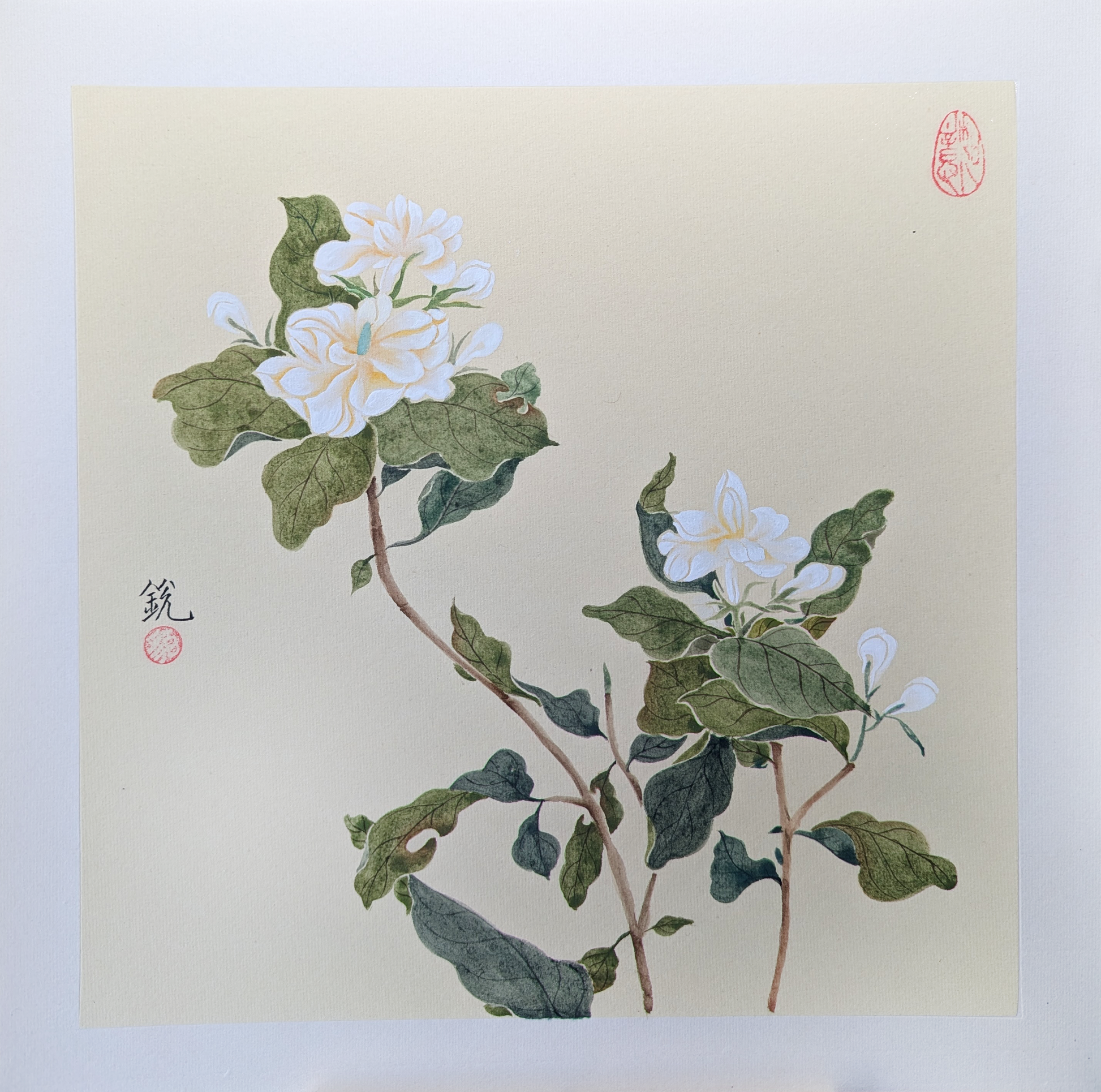 Jasmine's small white blossoms and gentle fragrance represent purity, simplicity, and refined beauty. In painting, it often conveys a quiet and graceful character.